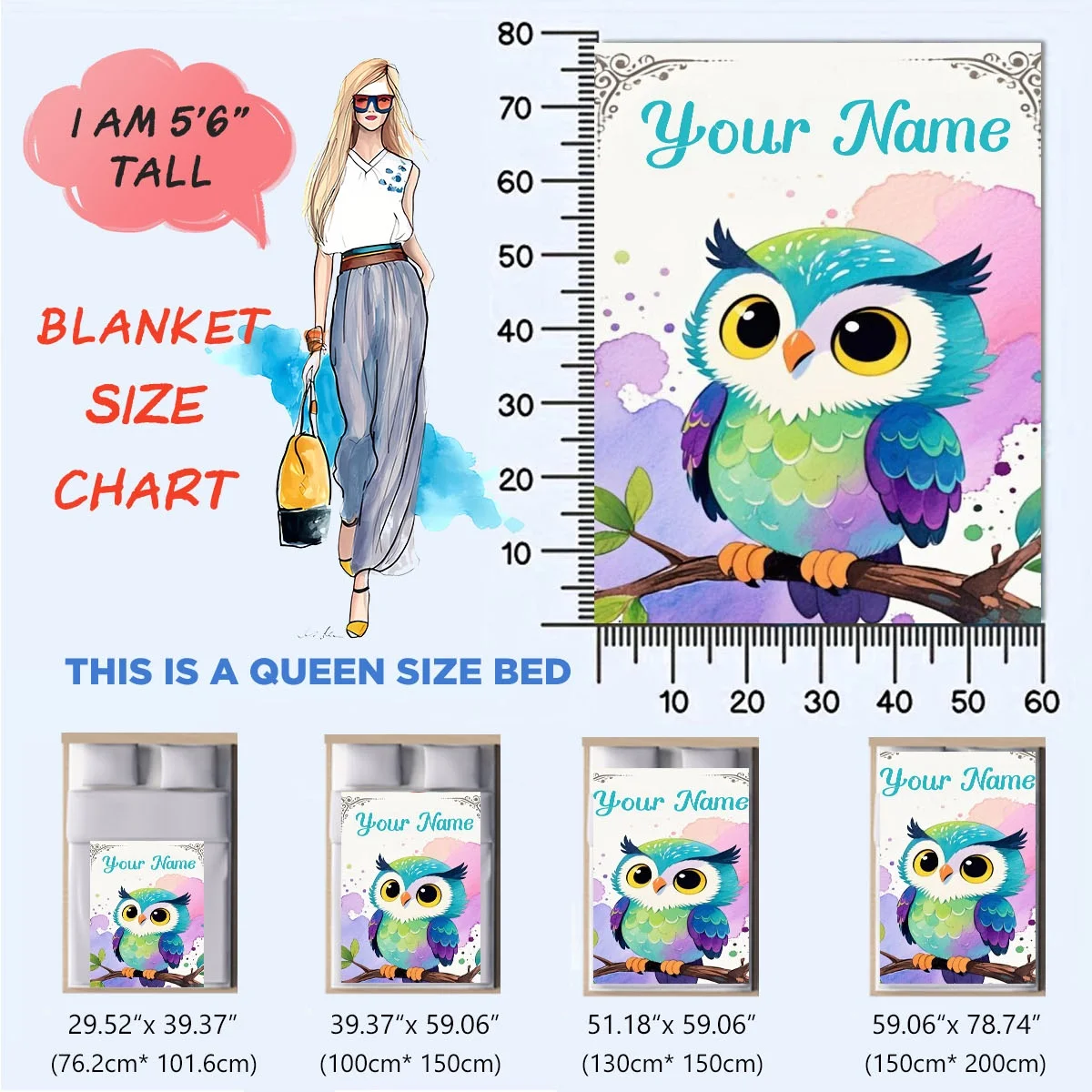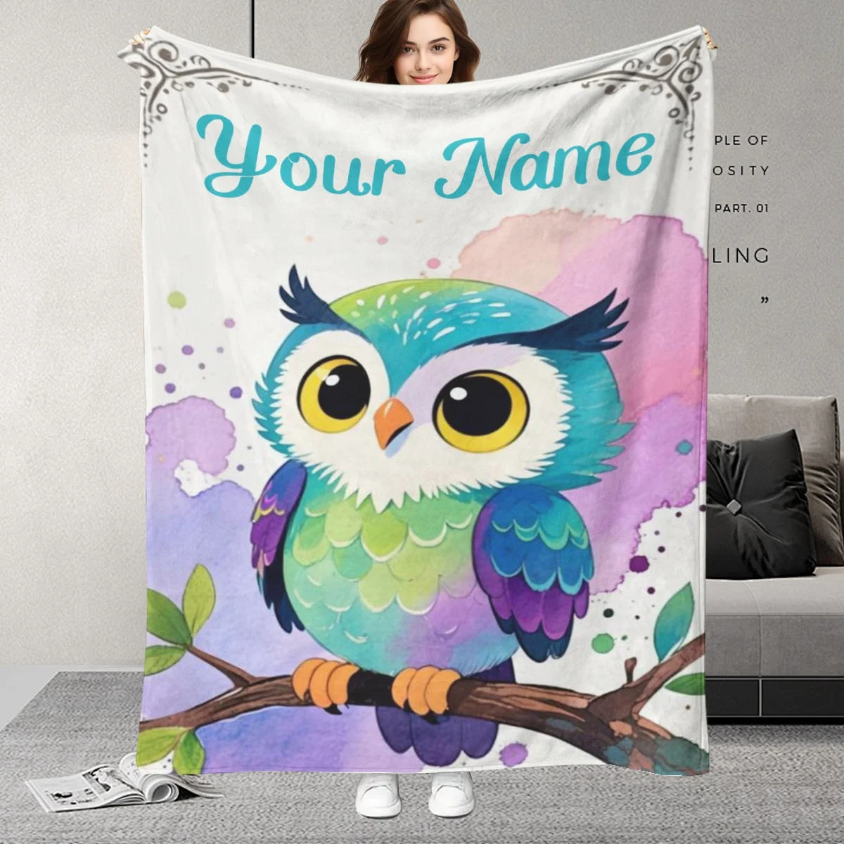 Customizable name owl print plush blanket, soft and warm,